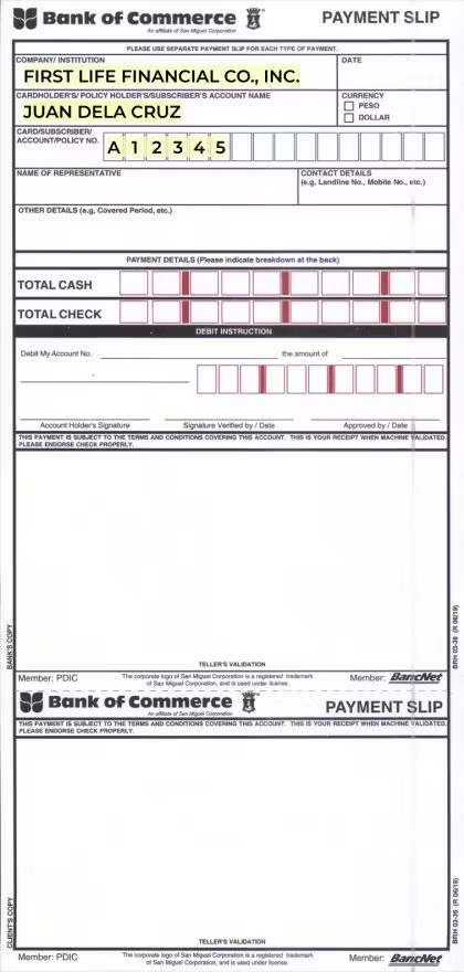 - Bank of Commerce: https://firstlife.com.ph/payment-options/bank-of-commerce